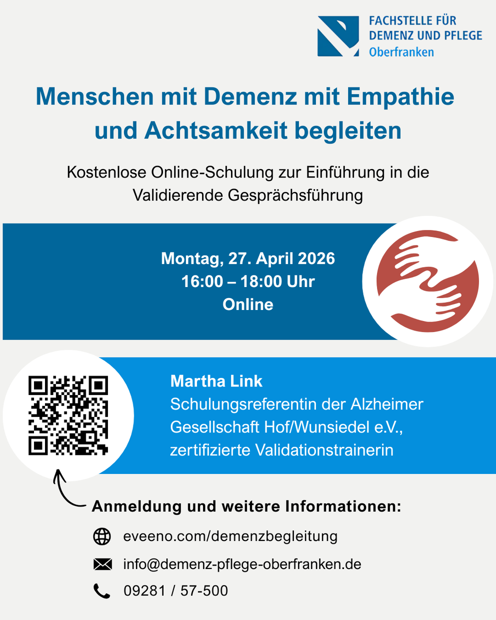 Die Fachstelle für Demenz und Pflege Oberfranken lädt am Montag, den 27. April 2026, zu einem kostenlosen Online-Vortrag über die validierende Gesprächsführung im Umgang mit Menschen mit Demenz ein.